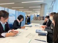 本校の課題研究は、1年次はグループで研究を進めます。グループ毎に研究対象やテーマを決めて、校外でのインタビュー活動を通して課題や、その課題の解決方法を考えます。このインタビュー活動を本校ではフィールドワークと呼んでいて、社会の最前線で働いている人たちとの対話は、社会に対する理解や関心を育てる場であり、自分たちの研究課題を深く考える貴重な機会です。フィールドワークは、課題研究の柱のひとつになっています。